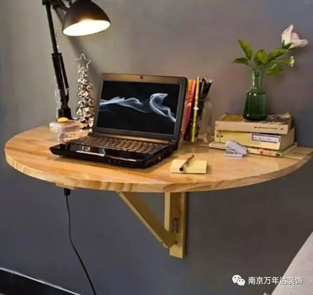 将支撑桌面的铁条松开后,桌子可贴墙悬放,需要时再撑起就行。