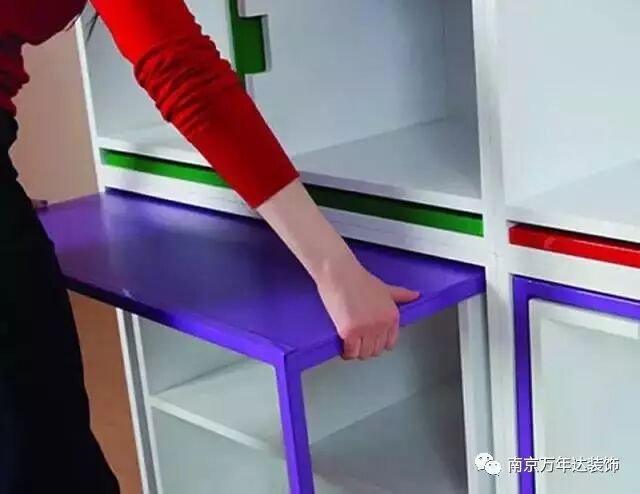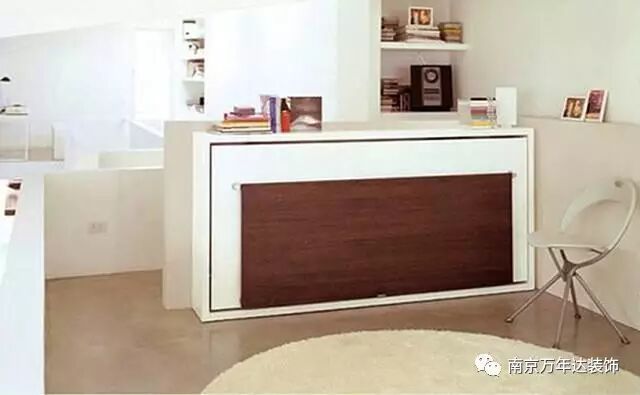 喜欢极简生活的朋友不容错过,柜子的一面做床板,贴上折叠桌,柜子上面还能放书、花盆之类的,完全是桌子、床、柜子合作式的共享生活。