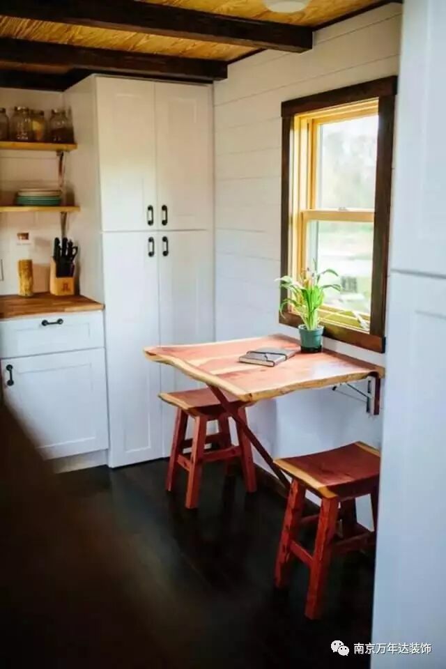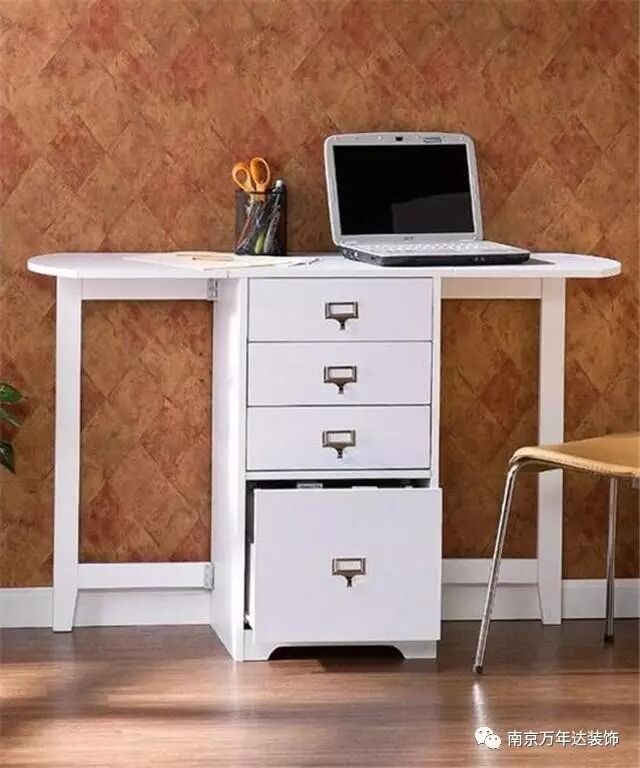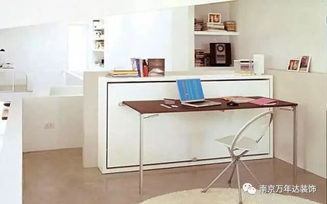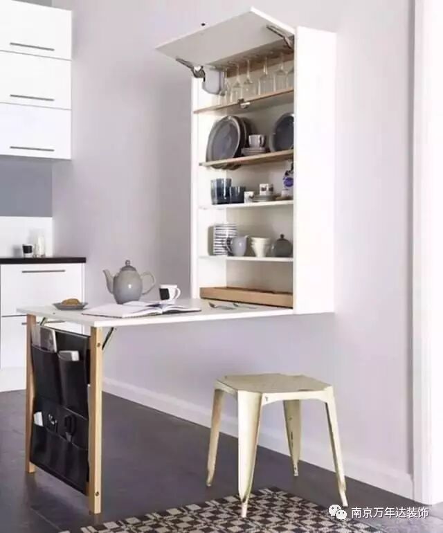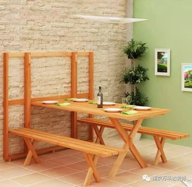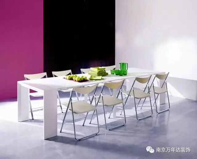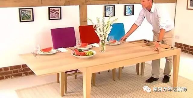 桌子、椅子于一体的家具闲置时贴墙放着,吃饭、闲聊时将折叠的部分(比如桌腿)分开,慢慢放下就可使用。