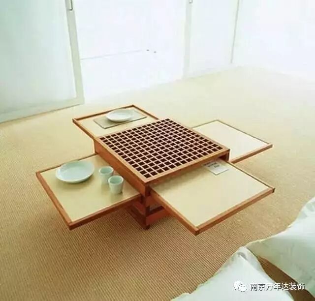 家里地板铺榻榻米的话,用推拉式桌子最能节省空间啦。平时收起来就是个正方形小桌子,也不占地方。有客人时四面拉出来可做桌板用,最大程度地利用空间。